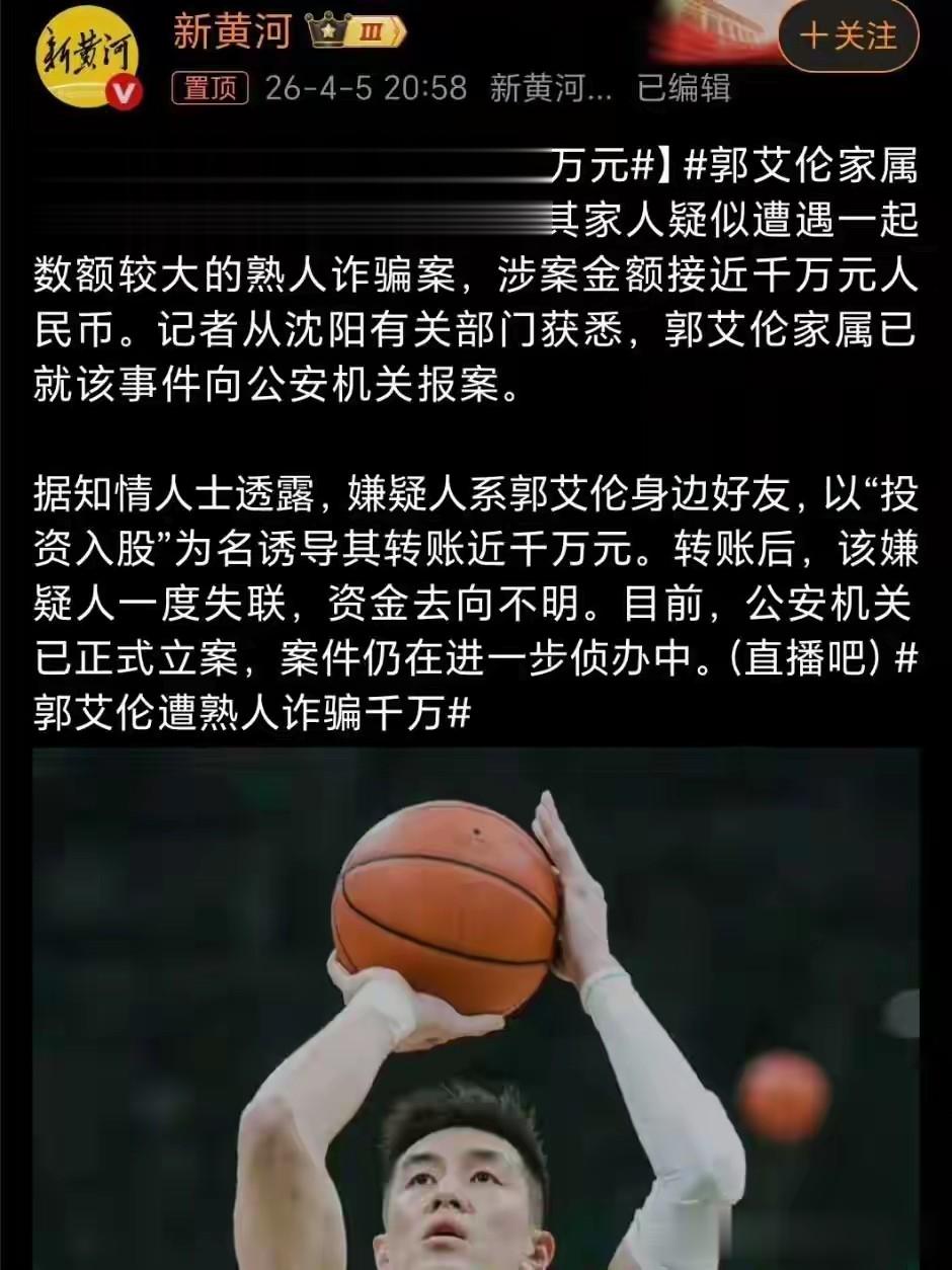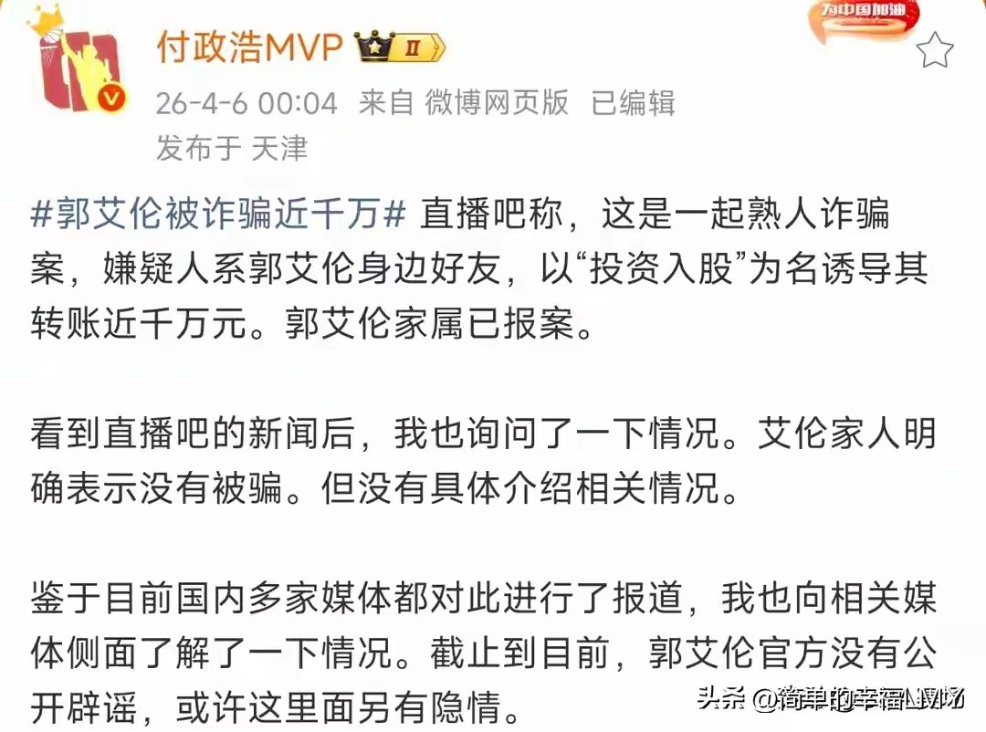 这则爆料细节看似详实,有具体人物、金额、作案手段,极具迷惑性,再加上郭艾伦本身是公众人物,“球星被骗”“熟人作案”“千万金额”等关键词自带流量,消息一经发布,便迅速在篮球圈层和网络社交平台引发小范围讨论。