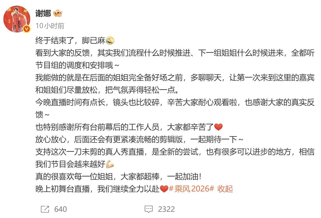 这场直播的主持人是谢娜和齐思钧,面对网友的吐槽,事后谢娜特意发了条动态回应:其实我们流程什么时候推进、下一组姐姐什么时候进来,全都听节目组的调度和安排!