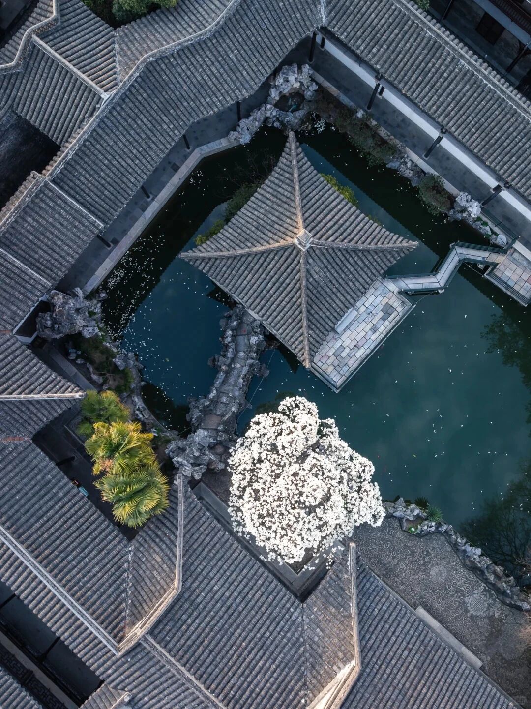 春天来何园,最不能错过的是玉兰花。园里的玉兰开得正好,洁白的花朵衬着青砖黛瓦,从回廊的窗棂间探出头来,像一幅精美的刺绣,清新脱俗。顺着光影在回廊里走,玉兰、海棠、山茶次第开放,粉白相间的花瓣点缀着飞檐翘角,如蝴蝶般轻盈,像一幅会动的画,每一眼都是惊喜。何园的主人是个有西洋眼光的人,园子里藏着不少西式元素,玻璃花窗、铁艺栏杆,与中式建筑完美融合,碰撞出独特的火花。坐在水边的石凳上,看池鱼游来游去,灵动活泼;看花影在水面晃动,波光粼粼,时间一下子就慢了,仿佛穿越回那个优雅浪漫的年代。