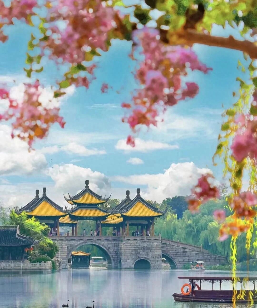 春天是瘦西湖最美的季节。琼花开了,如雪般洁白,簇拥在枝头;海棠红了,似霞般绚烂,点缀在岸边;垂柳绿了,嫩黄的枝条随风起舞,泛起层层绿浪。沿着长堤春柳慢慢走,看画舫从五亭桥下缓缓穿过,船娘哼着扬州小调,桨声欸乃;看白塔倒映在湖水里,洁白如玉,与蓝天相映成趣;看二十四桥在夕阳下闪着金光,波光粼粼,美得不真实。走累了,找个长椅坐下,看水里的倒影晃啊晃,看游船上的游客在拍照,听风拂过柳枝的沙沙声——什么都不想,就那么坐着,让时光慢慢流淌,舒服得很,仿佛所有的疲惫都被这温柔的春光抚平。