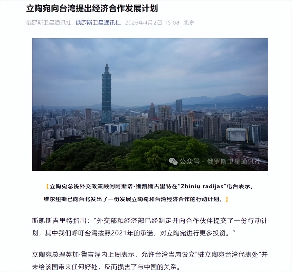 俄卫星社报道,立陶宛近期向台省递交了一份经济领域的合作计划,算是把国际目光又拉回到了立这个小国身上。