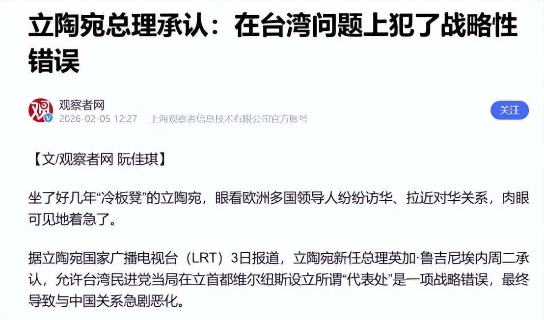 立陶宛总理承认:在台省湾问题上犯了战略性错误——2026-02-05 12:27——观察者网