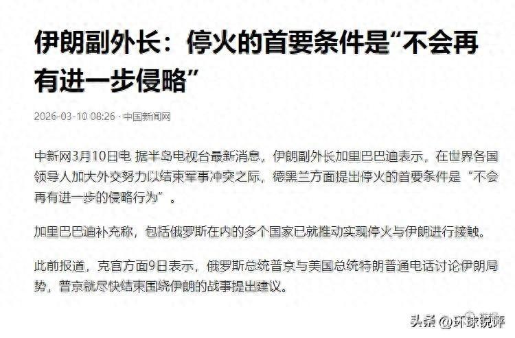 中国新闻网 2026-03-10:伊朗副外长:停火的首要条件是 “不会再有进一步侵略”