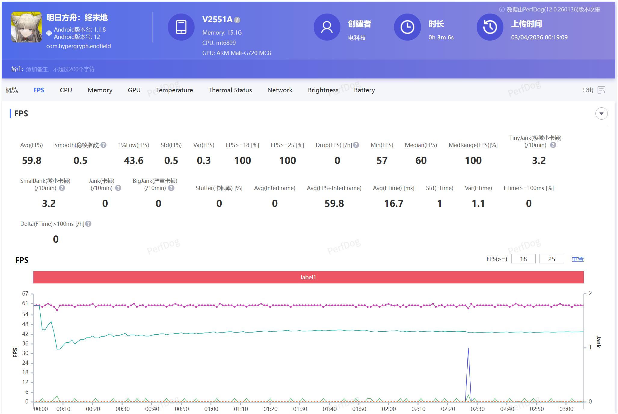 最高画质下《明日方舟:终末地》平均帧数稳定在59.8fps,表现同样不错。