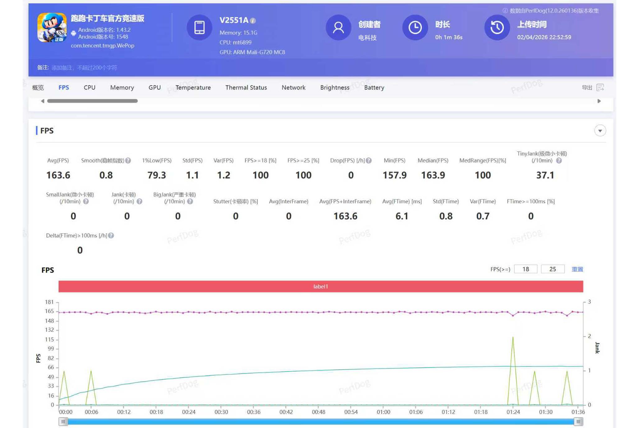 在帧数开到最高档下,《跑跑卡丁车官方竞速版》平均帧数稳定在163.6fps,游戏过程中驾驶丝滑流畅,反馈顺畅。