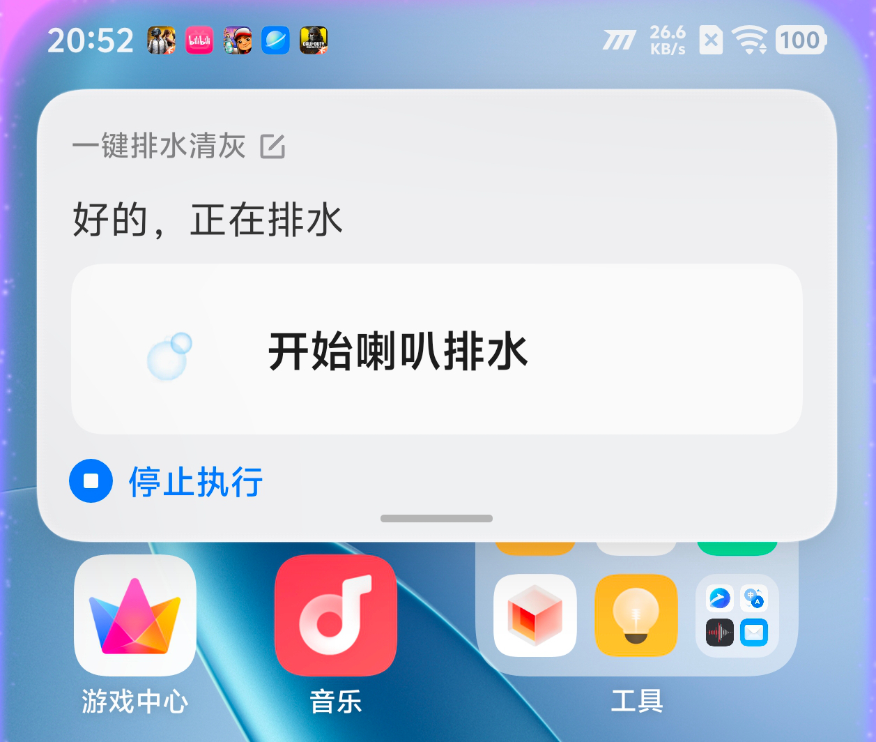 值得一提的是,iQOO Z11甚至还为机器配备了“一键排水清灰”功能。在蓝心小V中说出相应指令,功能开启后,通过声波震动技术即可将听筒、扬声器内的水珠灰尘强力排出。