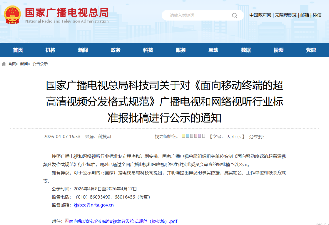 国家广播电视总局科技司已于2026年4月7日发布了《面向移动终端的超高清视频分发格式规范》的行业标准报批稿,并正在进行公示。