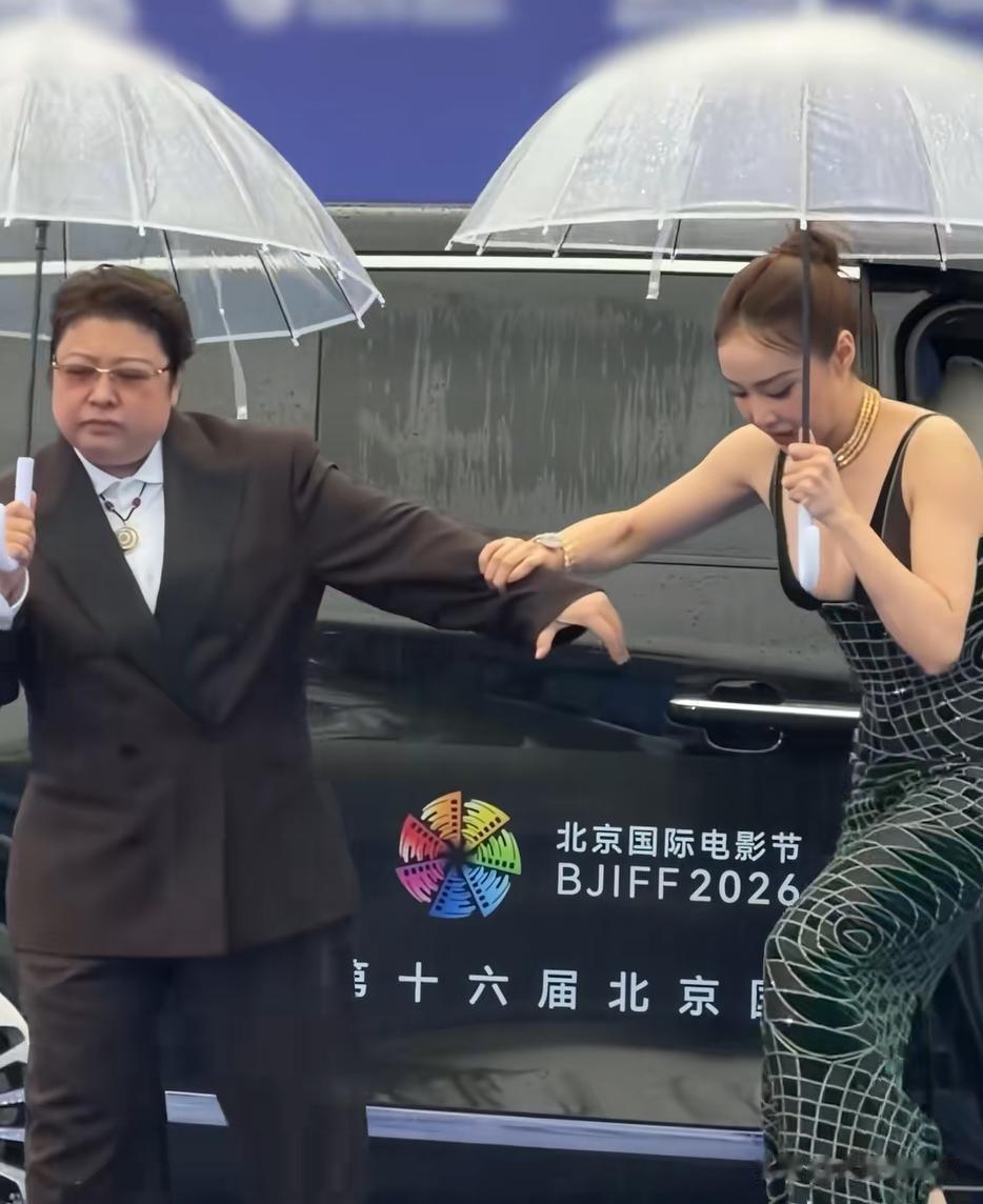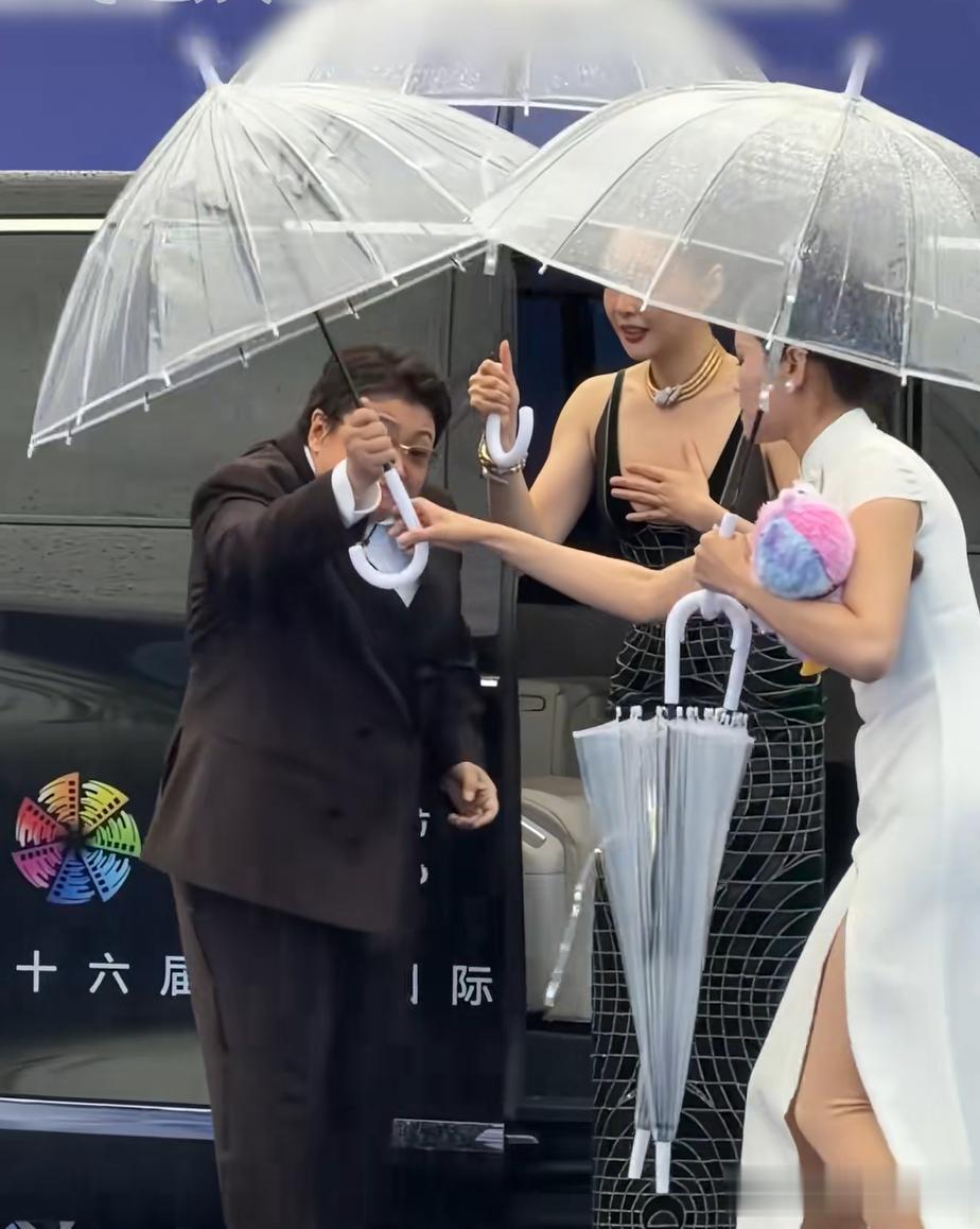 高叶身着紧身连衣裙,脚踩细高跟,雨天下车本就格外不便,韩红的贴心搀扶,细节尽显温柔与体贴。