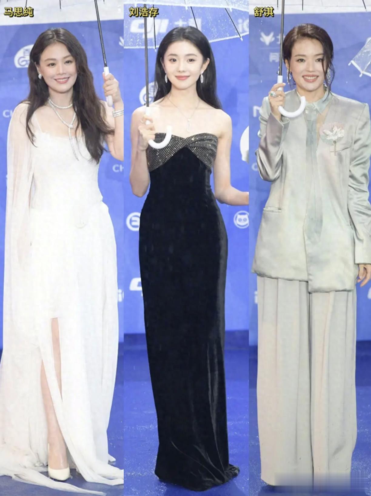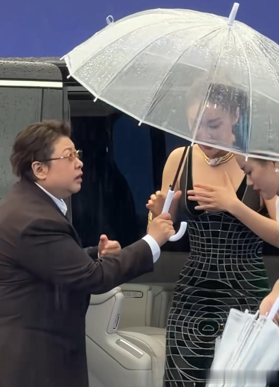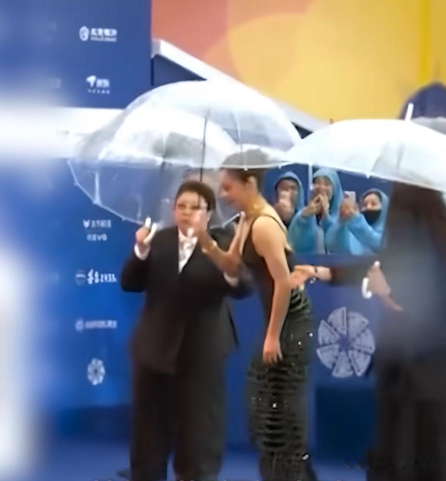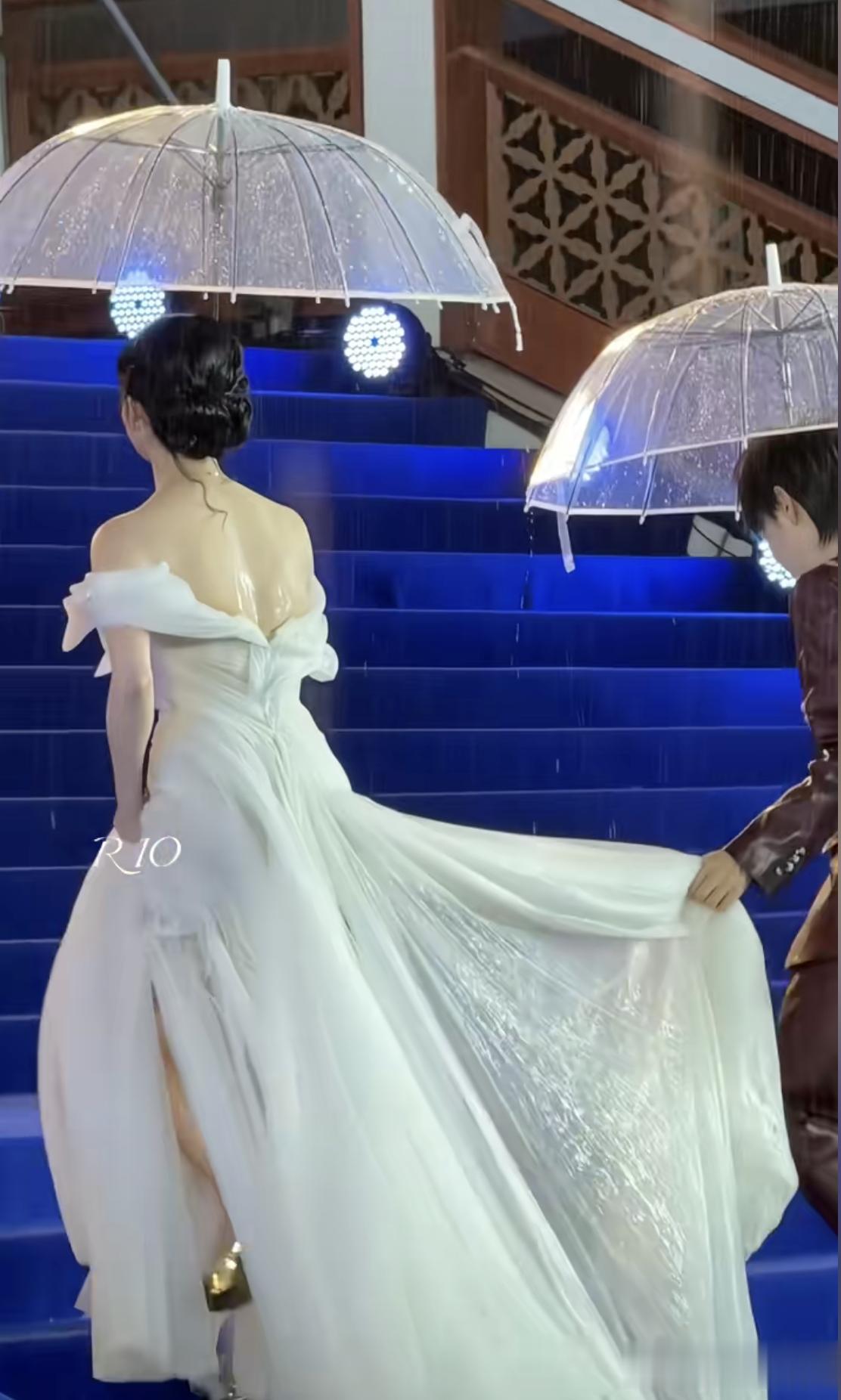于是乎,我们看到了平时红毯看不到的一幕,穿着高定礼服,化着精致妆容的女明星们个个撑着一把伞,提了裙子没顾上雨伞,多少有几分狼狈。