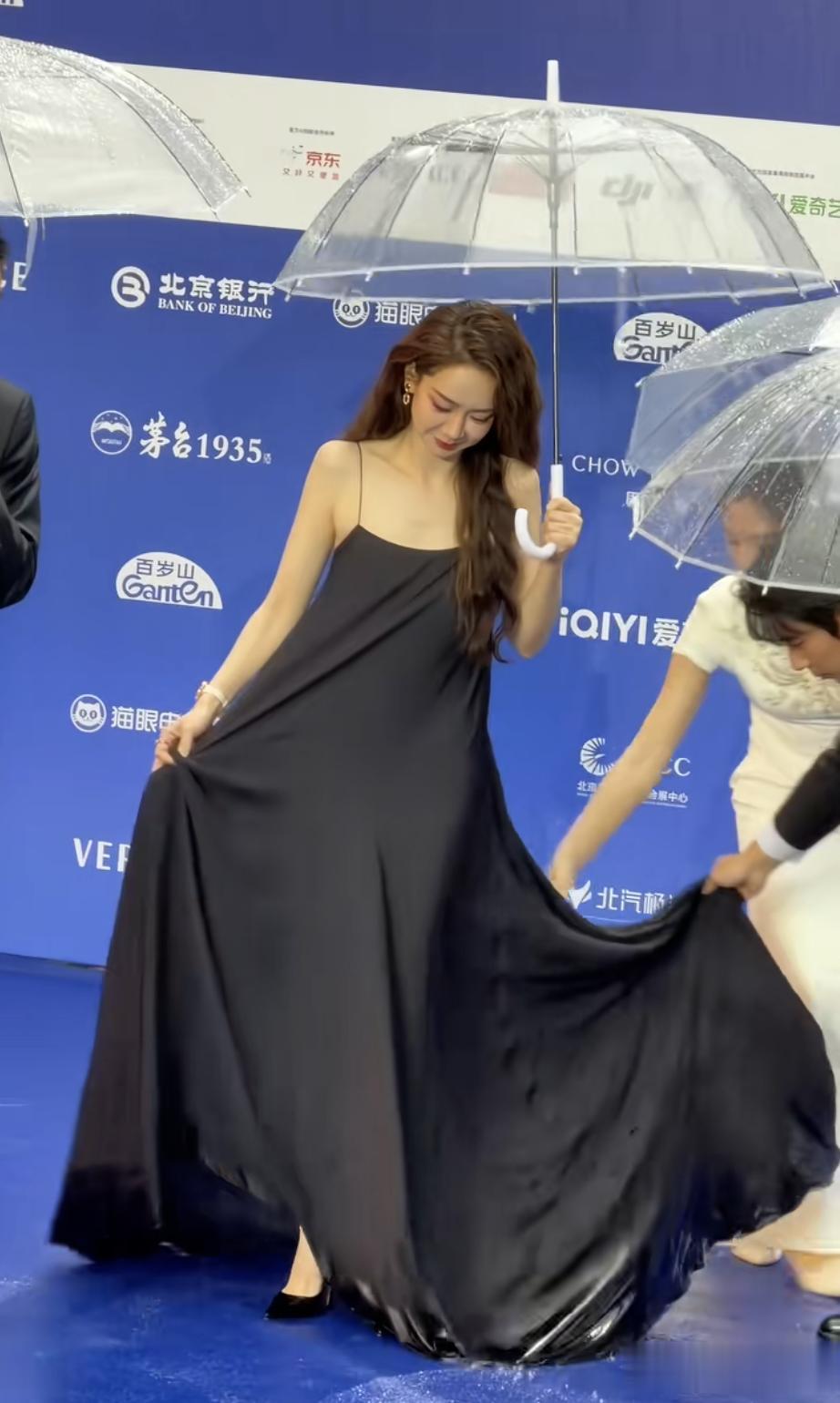 刘浩存穿着后开叉的礼服,下摆也没逃过被积水浸湿,不过小姑娘还挺敬业的,对着镜头依旧笑靥如花,该营业还得营业。