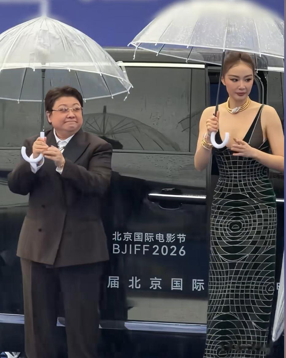 两位女士是搭乘同一辆车到现场的,当时雨越下越大,坐在右侧的韩红率先下车,冰冷的大雨瞬间扑面而来,密集的雨珠打得人睁不开眼。