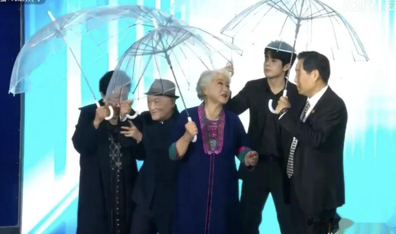 像牛犇、斯琴高娃,一个90岁,一个76岁,在这大雨哗啦啦下个不停的日子里也得上阵,且没有工作人员给予特殊照顾。