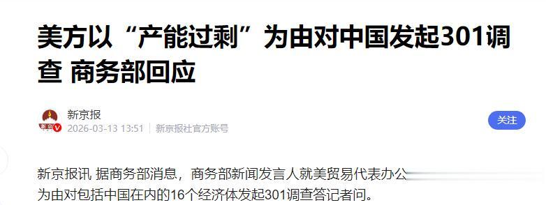 2026-03-13 13:51新京报社官方账号 美方以“产能过剩”为由对中国发起301调查 商务部回应