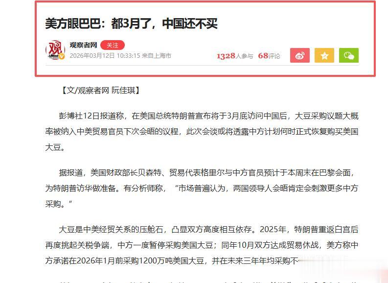 从经济层面来看,全球大豆产区并非只有美国,南美地区大豆供应充足、性价比可观,美国大豆还背负着13%的关税,竞争力本就大打折扣,中方完全有底气调整采购渠道,没必要非盯着美国大豆不放。