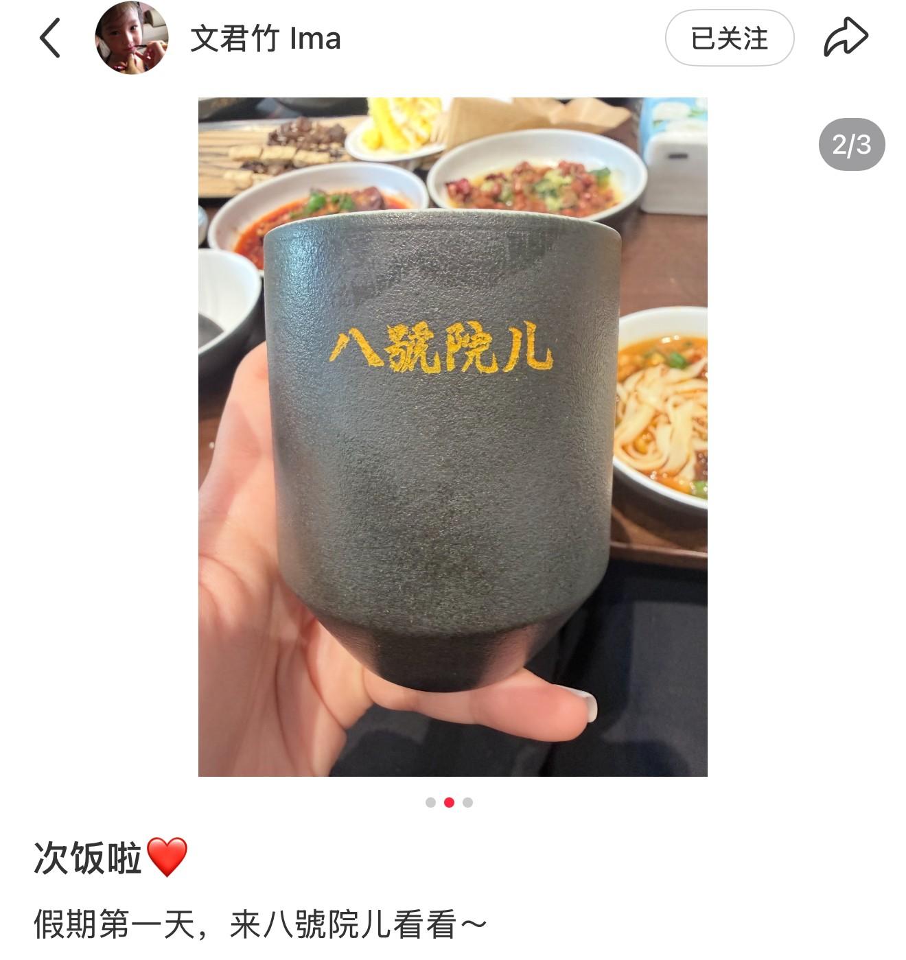 从她晒出的杯子可见,餐厅有着一个非常文艺的名字叫“八号院儿”,店里有肉夹馍、凉皮、油泼面等西安特色小吃。