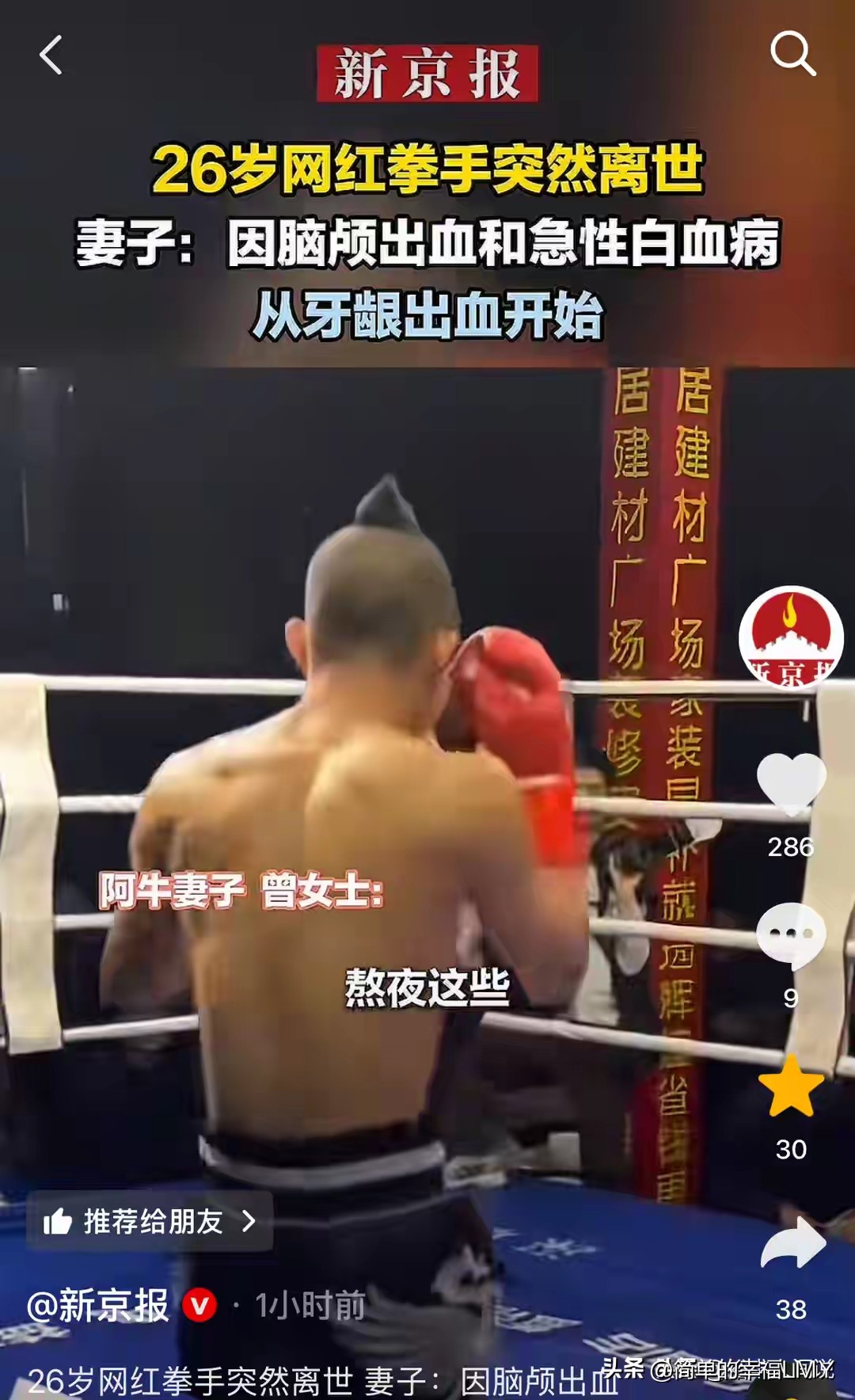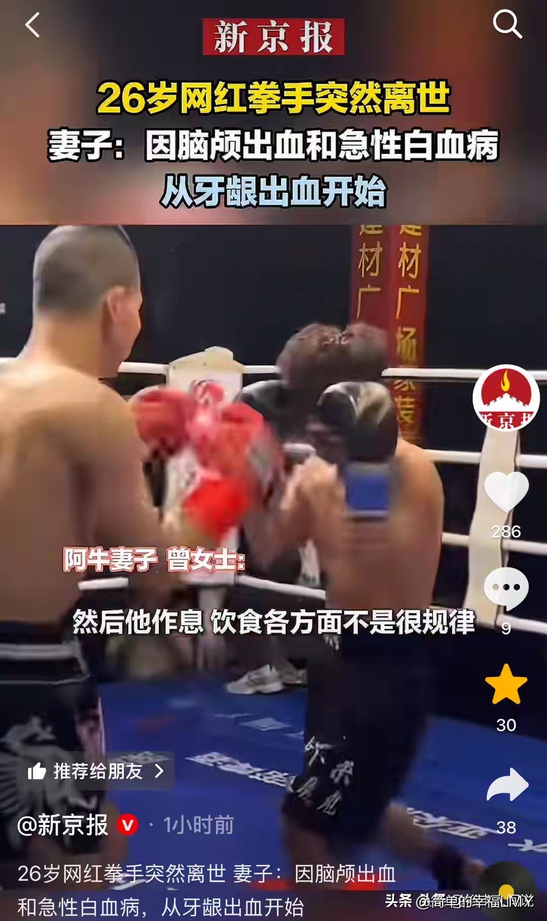 对于网友最关心的“脑出血和白血病是否与打拳有直接关联”,阿牛妻子表示,目前医学上还无法给出绝对肯定的结论,不能直接将病因归咎于拳击运动。