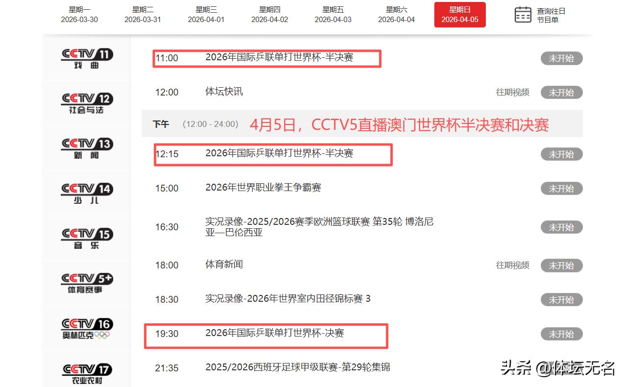 中央5台在今日的直播安排已经出炉,CCTV5将在上午11点00和中午12点15,转播世界杯半决赛!晚间19点30,CCTV5直播女单决赛和男单决赛,球迷们记得在电视前为国乒加油助威,见证冠军诞生!