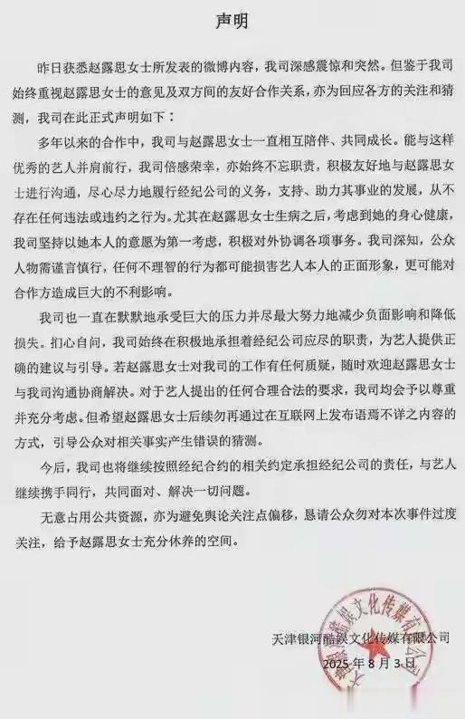 2024年底,赵露思突然被拍到深夜送急诊,后来发声明称突然失语,被诊断为重度抑郁症,退出了当时正在拍摄的《恋人》剧组。