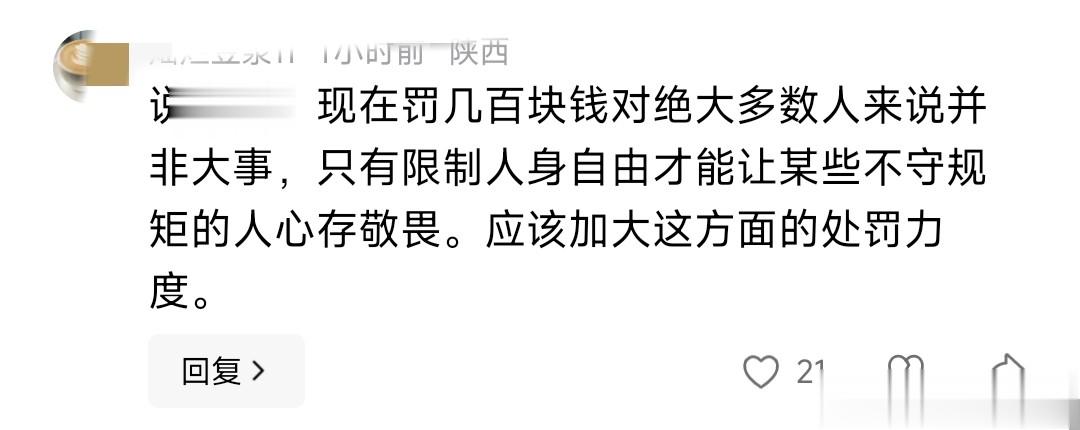 有网友说,现在几百块罚款对多数人不算事,只有限制人身自由才能让不守规矩的人敬畏,应该加大处罚力度。我觉得说得太对了,光罚钱真的没威慑力。