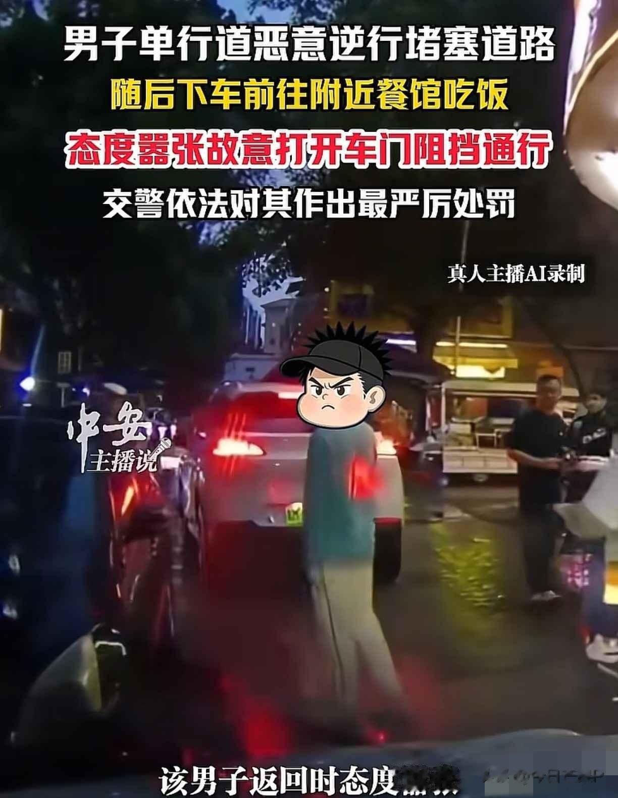 过了半小时,有司机打电话报警,交警十分钟后赶到现场,打电话没人接听,他们一家家餐馆找过去,直到下午一点才在店里看到那个人,他穿得干净整齐,坐在那里和朋友聊天说话,交警让他把车挪开,他抱起胳膊说不想挪车,后来干脆自己拉开驾驶门,把车门敞开着,让本来就不宽的路变得更难走,有人录下他说的话,他说就是不挪车,看能把他怎么样,这话好几个人都听到了。