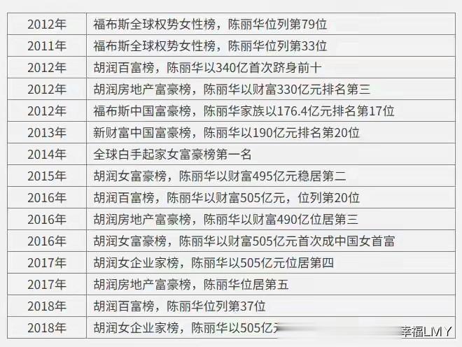 凭借着横跨地产、高端会所、商业运营等多领域的商业布局,陈丽华的财富实现了几何级增长,她多次登上胡润女企业家榜,身价一路飙升,甚至一度登顶中国女首富的位置。