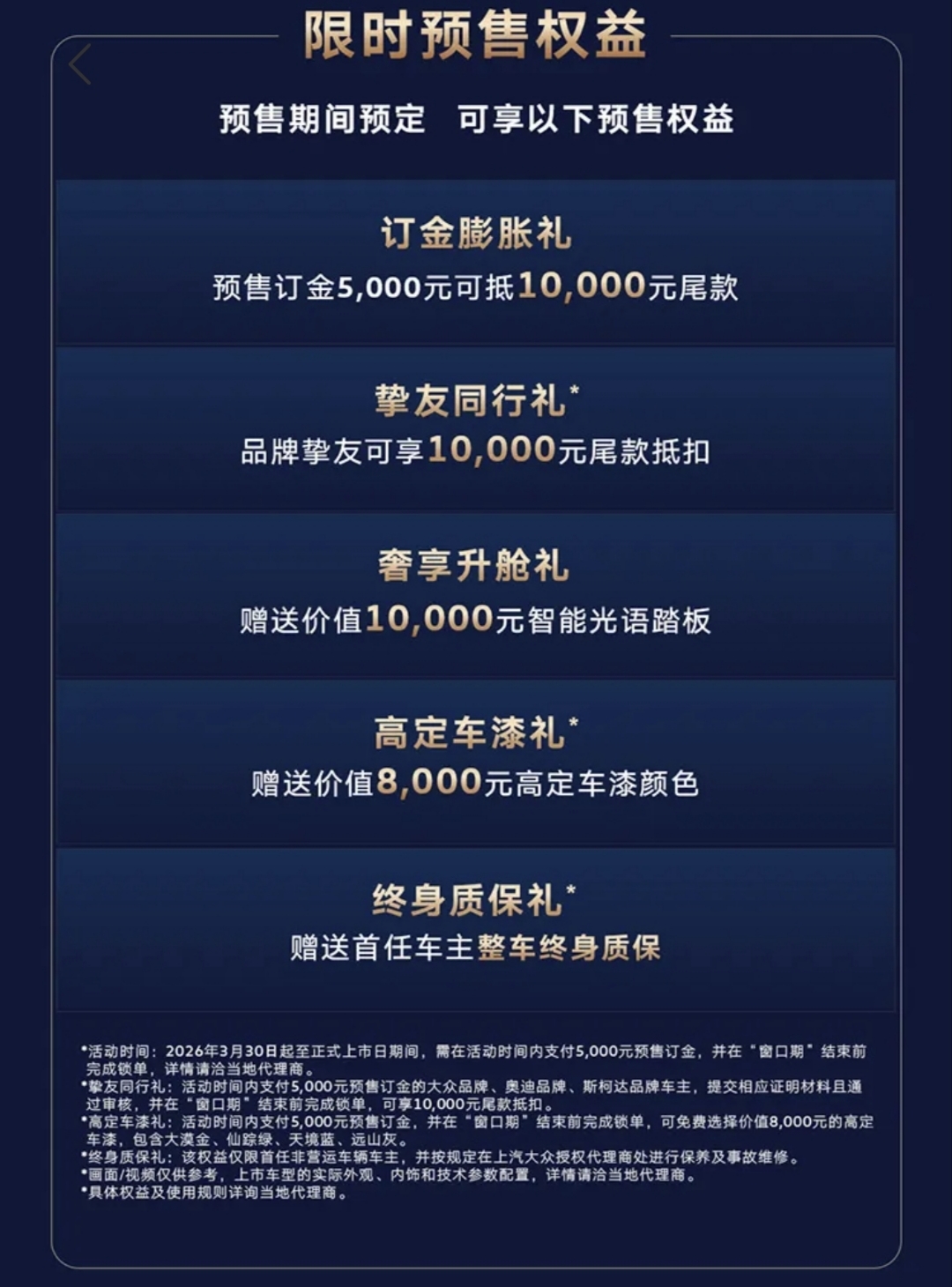 从品牌与售后来看,大众百年造车底蕴+全国超2000家经销商网络,维修保养更便捷、成本更低,售后体系稳定性远超新势力。预售权益也很给力:5000元订金抵10000元尾款、老用户额外享10000元尾款抵扣、赠送智能光语踏板与高定车漆、首任车主整车终身质保,综合优惠超3万。