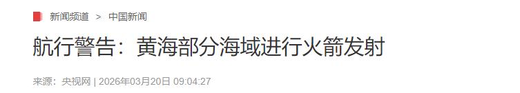 信息来源:央视网:航行警告:黄海部分海域进行火箭发射