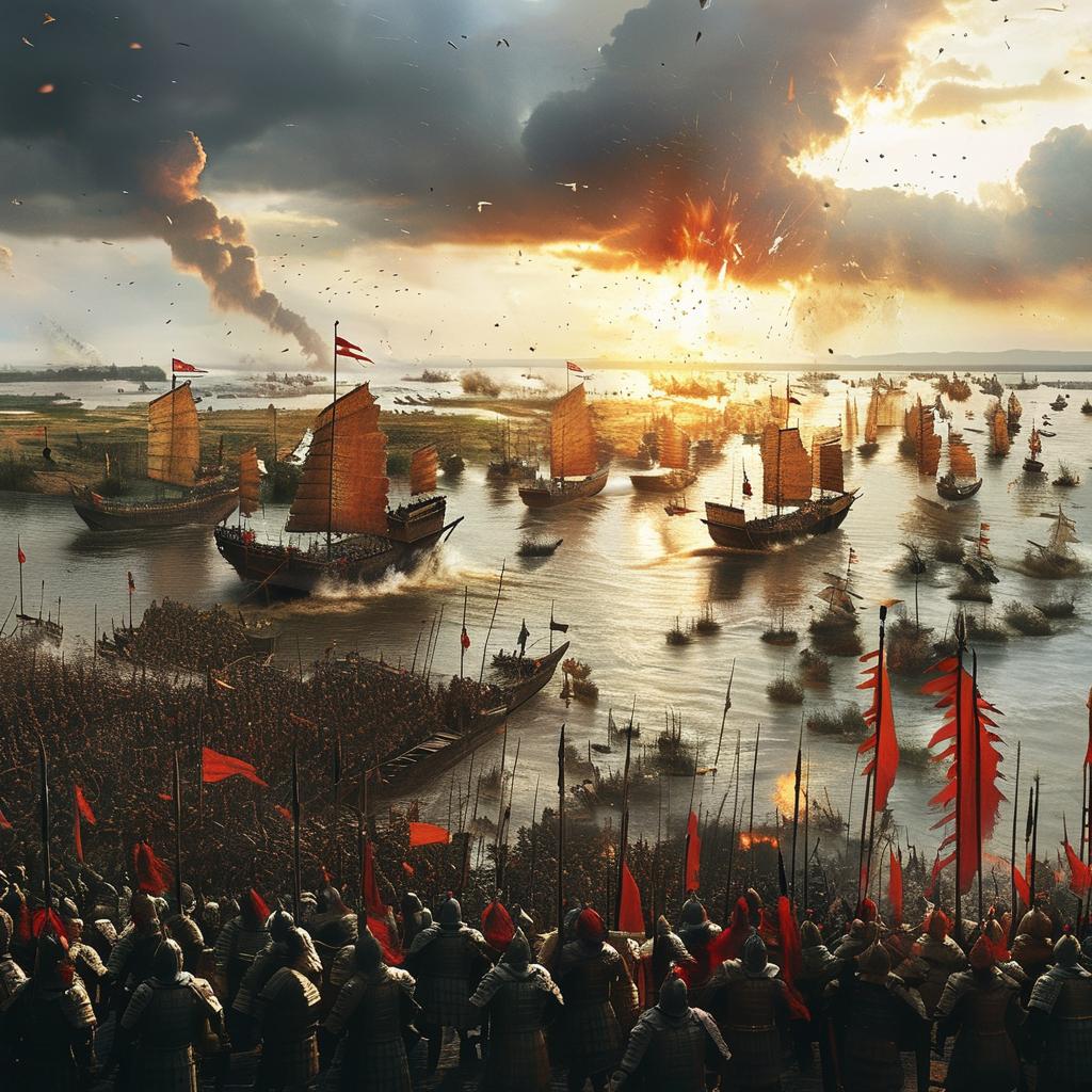 1363年,陈友谅举60万大军围洪都,朱元璋率20万驰援,中国史上最大水战爆发。陈友谅战舰高大、铁索相连,朱元璋船小但灵活。