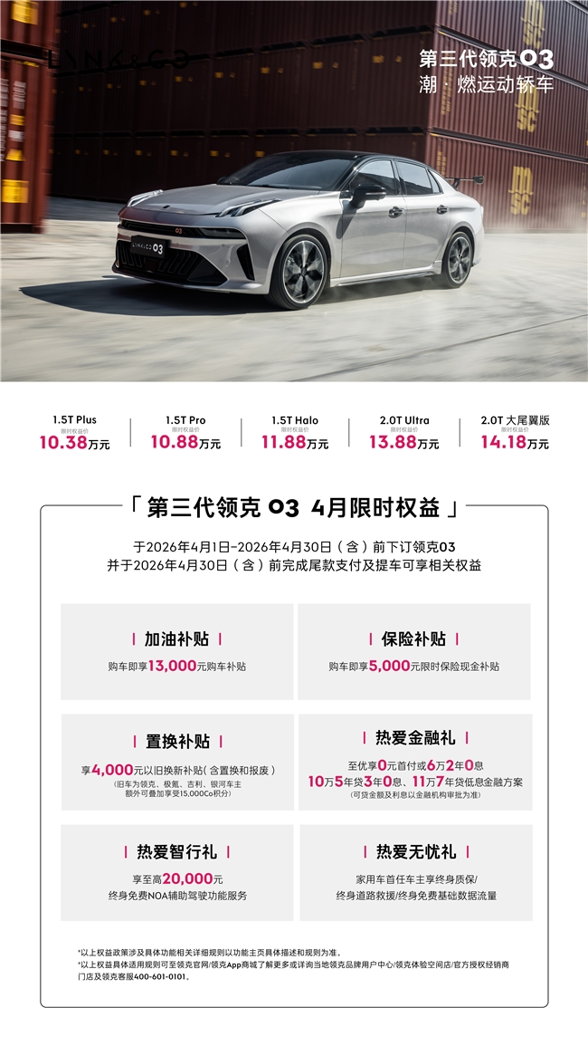 本次油补为限时福利,参与条件明确:用户需在2026年4月1日至4月30日(含)下订领克03,并在当日前完成尾款支付及车辆提车,方可享受该补贴。油价高企的当下,领克03这波福利直击用户核心需求,彰显品牌诚意,也为有意选购燃油性能车的消费者提供了难得契机,感兴趣的用户需抓紧时间把握。
