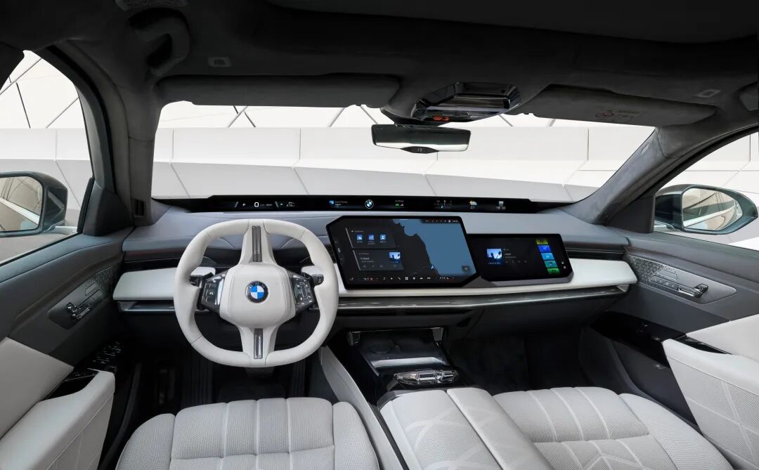 新7系配备了宝马的全景iDrive,这是位于风挡玻璃底部、横跨A柱到A柱的屏幕。仪表板中央是一块17.9英寸的信息娱乐显示屏,并且,宝马首次为这款车型标配了一块乘客屏。