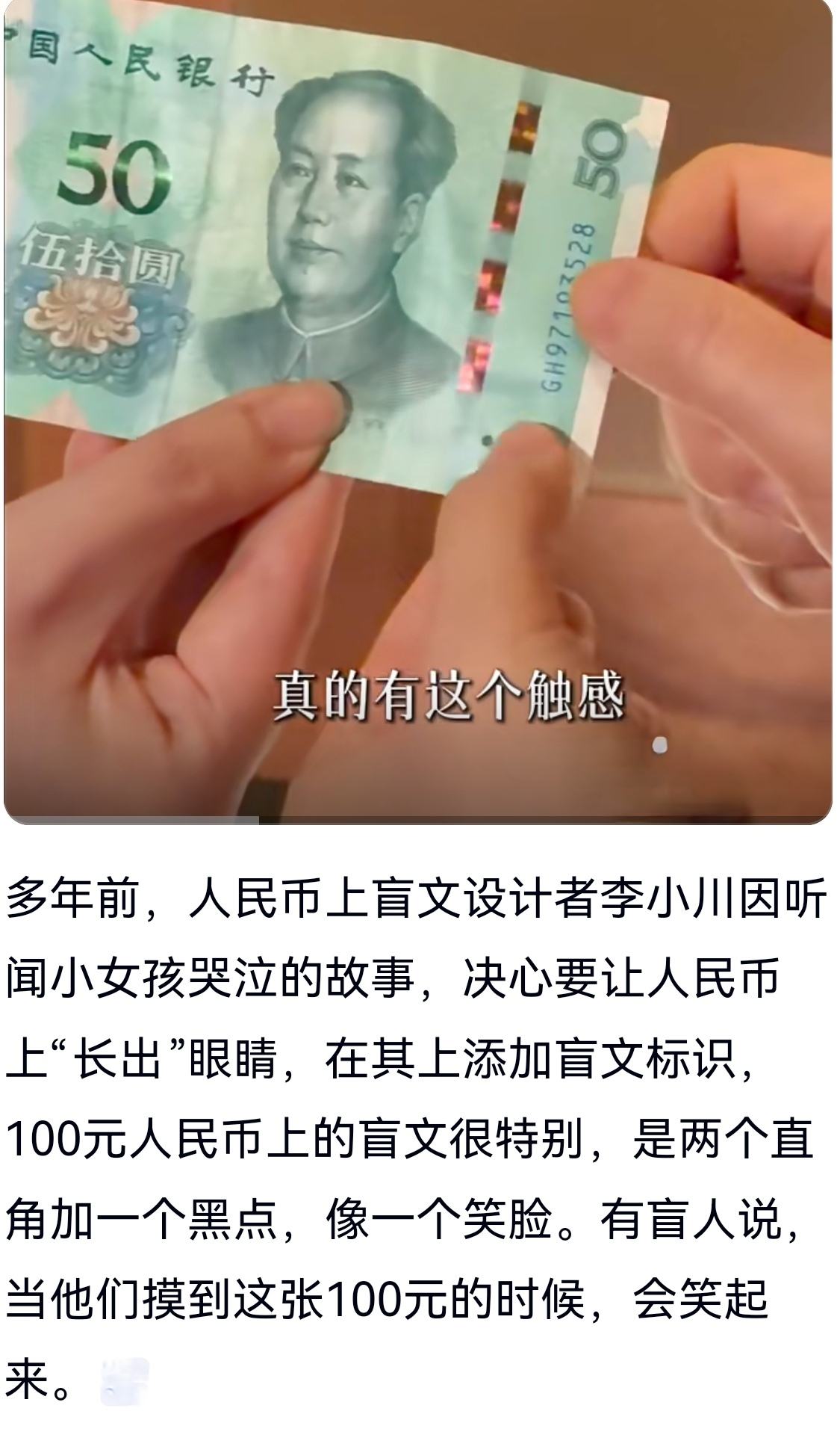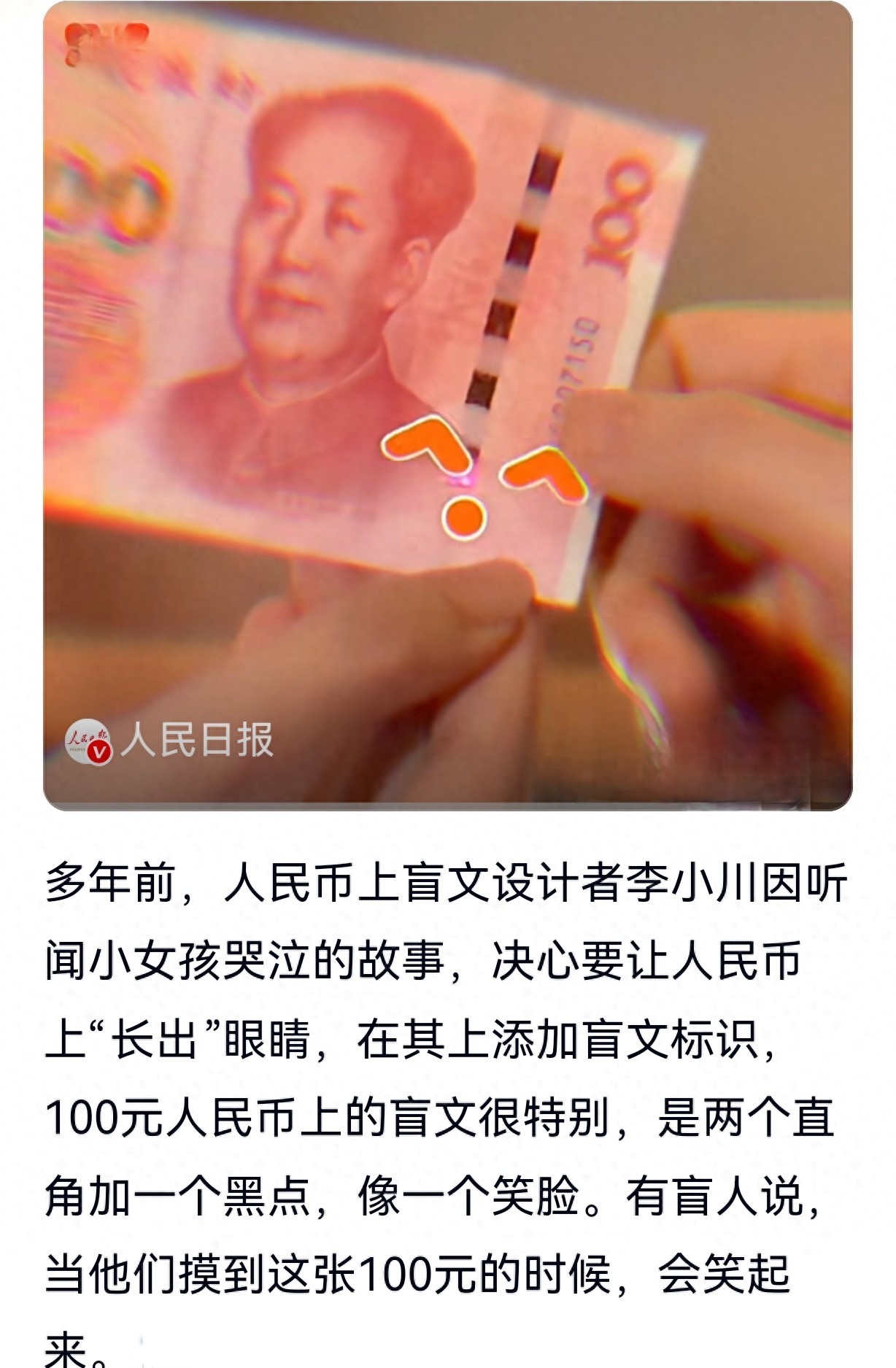 很多人不知道,我们天天用的100元人民币上,藏着一个特别温柔的设计。多年前,人民币盲文设计者李小川,因为听到一个小女孩哭泣的故事,下定决心要让人民币“长出眼睛”,专门为盲人朋友加上了盲文标识。