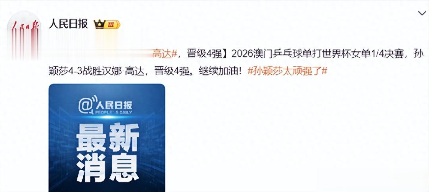 北京时间4月4日下午,澳门世界杯女单1/4决赛,孙颖莎苦战7局,以4-3险胜埃及小将汉娜高达,艰难打进4强,其中决胜局13-11!汉娜高达是国乒劲敌,她今年只有18岁,已经是顶尖选手,在1/8决赛鏖战7局淘汰了华裔名将袁嘉楠,而在这一轮,给国乒世界第1的孙颖莎也制造了很大的困难!