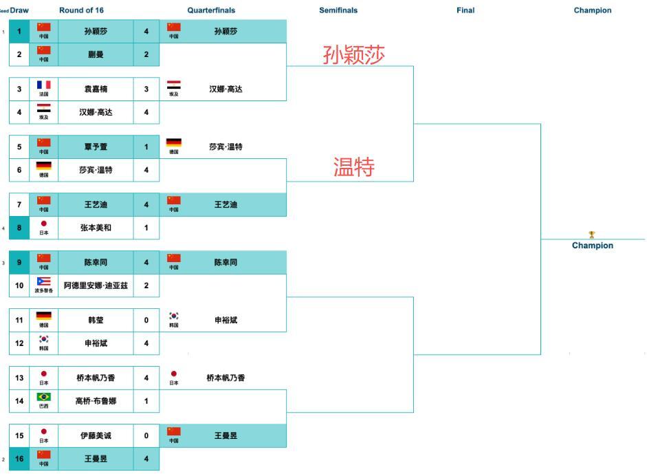 另一场,王艺迪0-4惨败德国名将温特,也让人措手不及,大迪连一局胜利都没赢,自己的实力没有发挥出来!这样的话,孙颖莎和温特在半决赛相遇,争夺女单决赛名额,双方职业生涯交手,莎莎取得全胜,而且在2022年和2023年的WTT新加坡大满贯,莎莎都是3-0直接横扫温特,没有给对手太多的机会!不过,孙颖莎在世界杯的状态有起伏,面对温特不能松懈,肯定会遇到比较大的挑战,希望顶住压力!