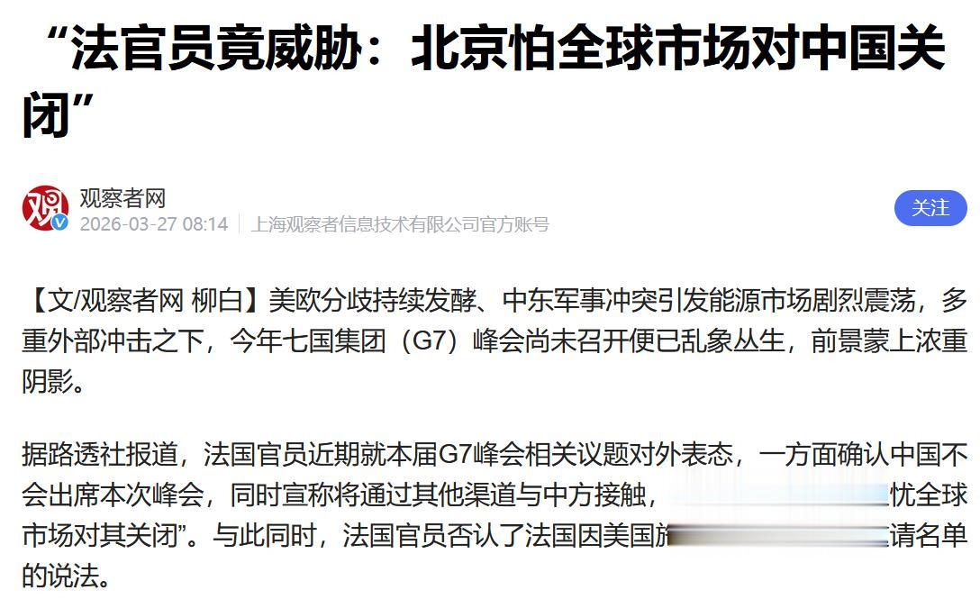 大家好,我是安叔。G7,曾经富裕的代名词,是诸多国际组织中非常亮眼的一个。而如今,G7就有意思对我国开放,但受到了拒绝,对此,作为今年东道主的法国人有些不满。