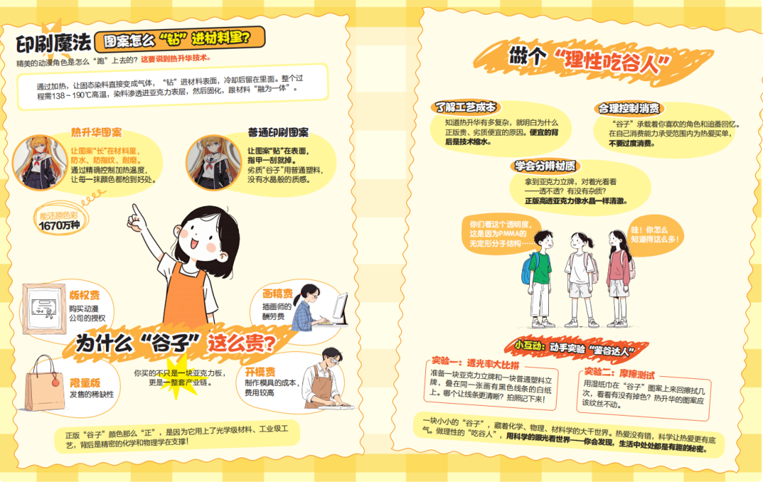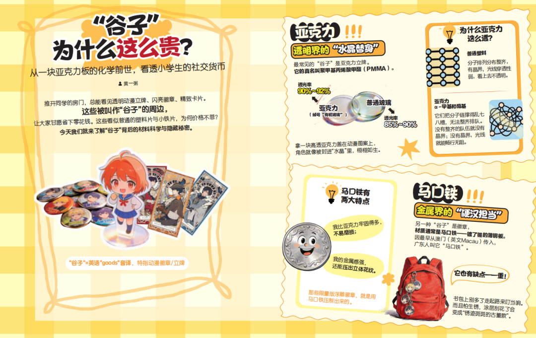 推开同学的房门,总能看见透明动漫立牌、闪亮徽章、精致卡片。这些被叫作“谷子”的周边,让大家甘愿省下零花钱。看似普通的塑料片与小铁片,为何价格不菲?今天我们就来揭秘谷子背后的材料科学与隐藏的秘密。