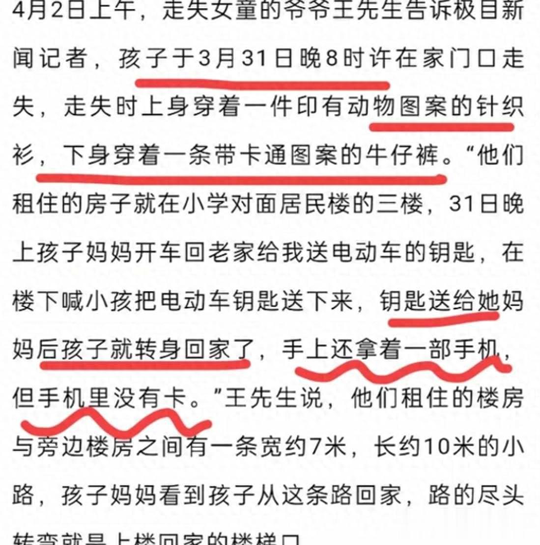 3月31号晚上8点半,6岁的佩佩从家里三楼下来,说要给妈妈送电瓶车钥匙,她没有走正门的楼梯,也没选小区的主路,而是拐进一条紧贴着墙的小土路,那条路很窄,没有路灯,一边是水泥墙,另一边直接下去就是荒地,家人说亲眼看见她走进去之后,就再没出来。