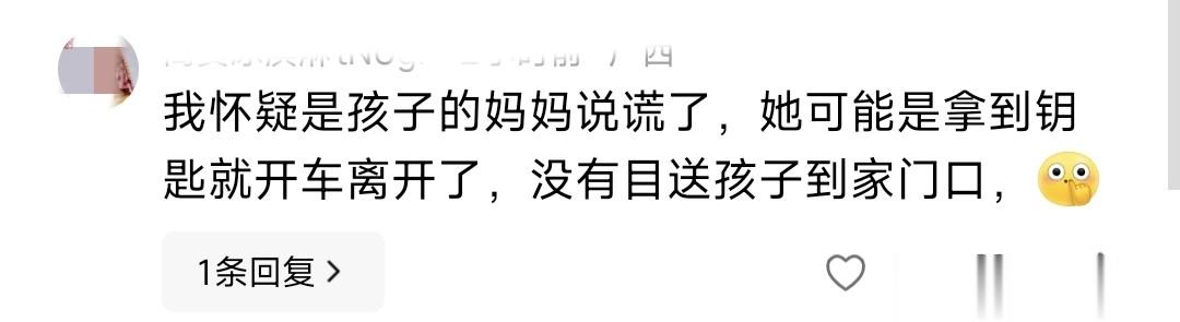 还有网友说,怀疑孩子妈妈说了谎,可能拿到钥匙就开车离开了,没目送孩子到家门口。我觉得这种怀疑有一定道理,关键环节确实得再核实。