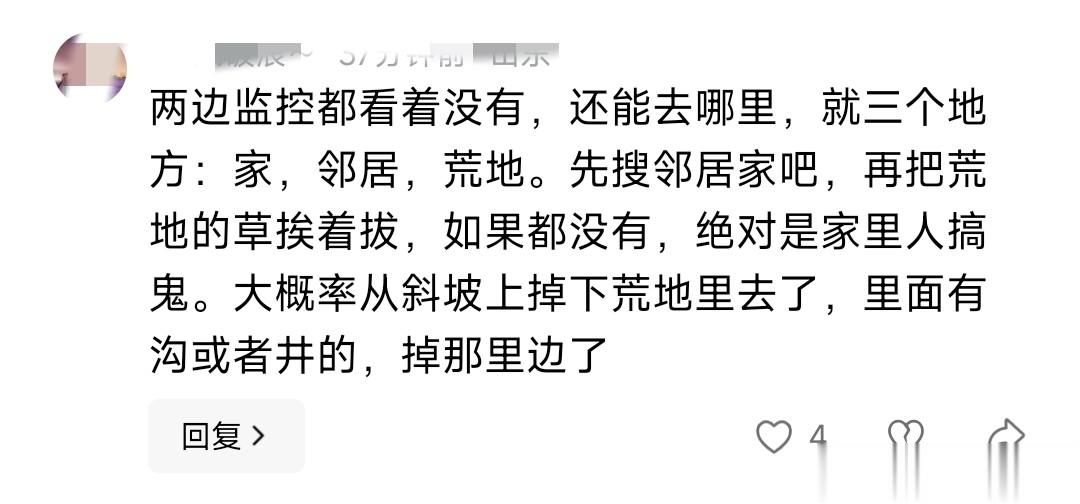 有网友说,两边监控都没拍到,孩子只可能在家、邻居家、荒地这三个地方,建议先搜邻居家,再把荒地的草挨个拔了排查,如果都没找到,大概率是家里人搞鬼,也可能从斜坡掉进荒地的沟或井里了。我觉得排查方向很清晰,荒地确实是重点盲区。
