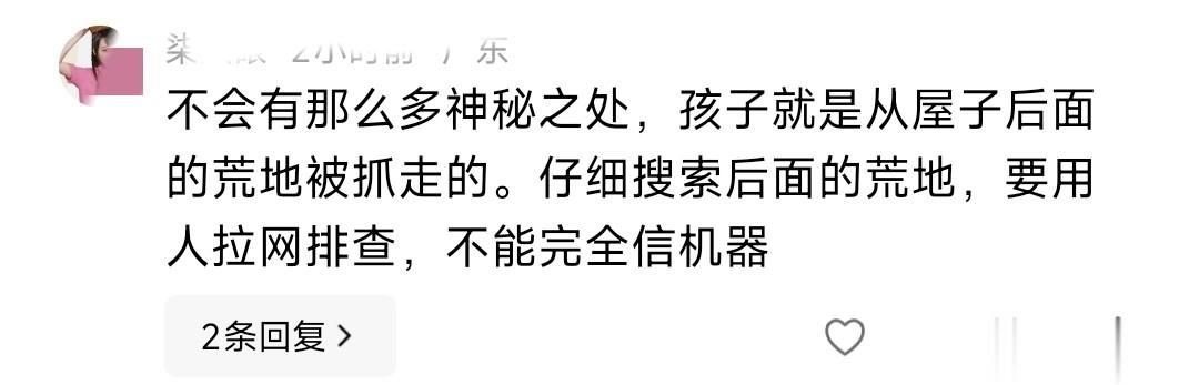 还有网友说,孩子没那么多神秘失踪的可能,就是从屋子后面的荒地被抓走的,得仔细搜后面的荒地,用人拉网排查,不能完全信监控。我觉得人工拉网排查很有必要,监控确实有覆盖不到的死角。