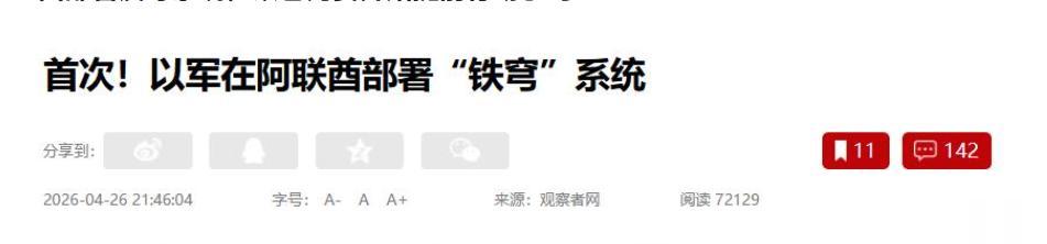 以色列走出关键一步经国际媒体核实,以色列正式在阿联酋部署“铁穹”反导系统,同时派遣现役军人常驻负责设备运维与实战拦截。