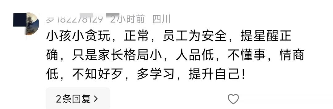 还有网友说,小孩小贪玩,正常,员工为安全,提醒正确,只是家长格局小,人品低,不懂事,情商低,不知好歹,多学习,提升自己!我认为家长的素质真的很关键,别把没教养当护犊子。