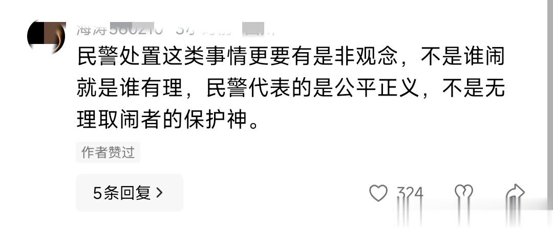 有网友说,民警处置这类事情更要有是非观念,不是谁闹就是谁有理,民警代表的是公平正义,不是无理取闹者的保护神。我觉得这话太对了,执法就该讲原则,不能被撒泼耍横的人裹挟。