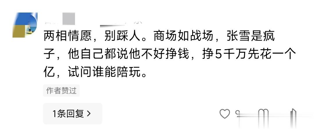 有网友说,两相情愿,别踩人。商场如战场,张雪是疯子,他自己都说他不好挣钱,挣5千万先花一个亿,试问谁能陪玩。