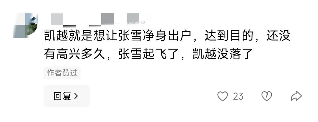有网友说,凯越就是想让张雪净身出户,达到目的,还没有高兴多久,张雪起飞了,凯越没落了。
