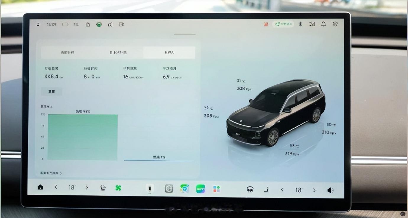再看能耗数据:行驶448.4km,耗时8小时,平均能耗16kWh/100km。注意这是一台车长超过5米2、车宽近2米、轴距超3米1的全尺寸SUV。这么大一台车,跑出百公里16度电的能耗,什么概念?很多中型SUV都做不到这个水平。更关键的是,它的里程占比里纯电占了99%,燃油只有1%。也就是说,这448公里几乎全程都在用电,增程器只是在最后7%电量时出来“打个卡”。