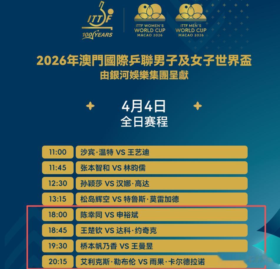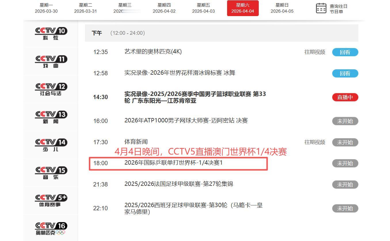 中央5台的直播安排已经出炉,CCTV5在晚间18点00直播澳门世界杯1/4决赛,不再是CCTV5+,陈幸同、王楚钦、王曼昱接连出战,冲击世界杯4强!