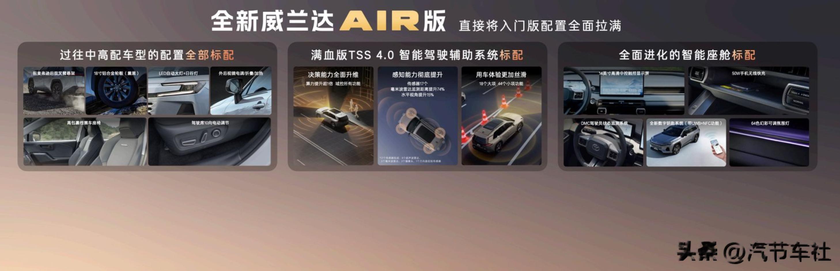 对于威兰达AIR版的配置定位,官方给到的说法是“入门即高配”,从标配看,后双叉臂 独悬、TSS 4辅助驾驶、前后驻车雷达、真皮方向盘、无线充电、64色氛围灯等配置,对于入门款车型来说,算的上是琳琅满目,甚至部分配置可视为“越级配置”。