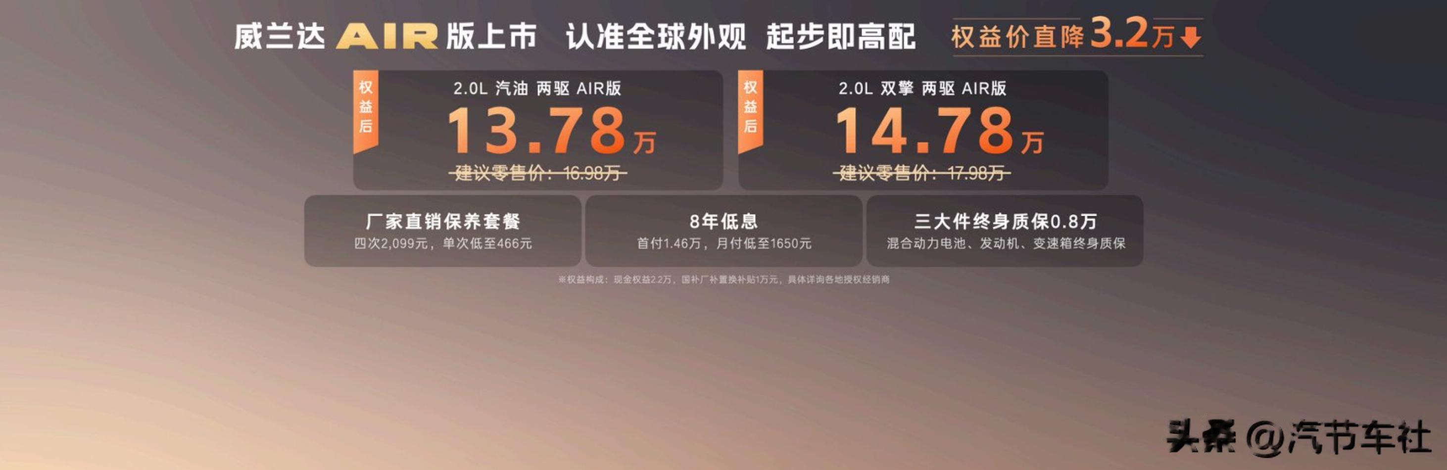 可见,这份权益价里面还有些门道,卡政策卡人,但2.2万元的现金优惠基本上不存在什么说法,相比上市初期,即便仅拿到现金优惠的情况下,威兰达AIR版的终端落地价,也稍微低了一些。
