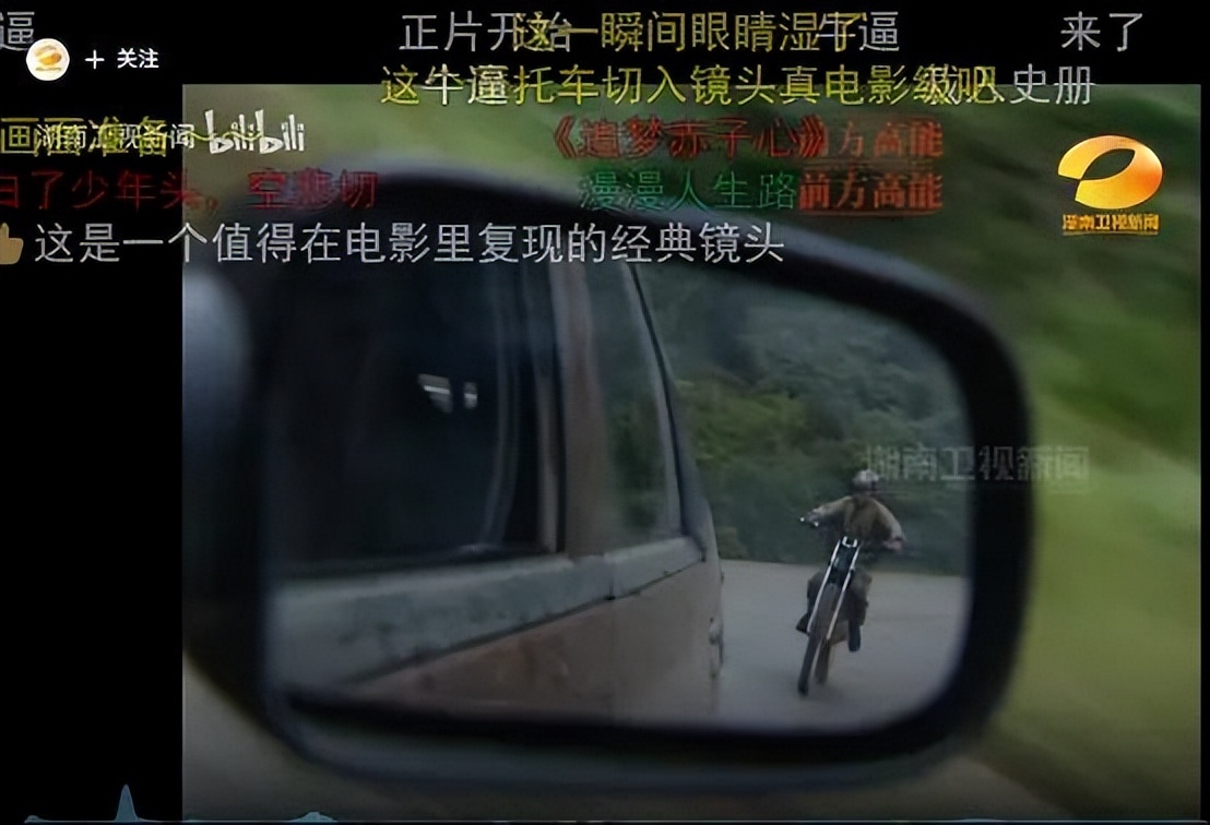 视频里最封神,也是网友说 “该拿普利策”那一幕,记者后视镜里张雪骑车猛追的画面,又像王菲的《如愿》: