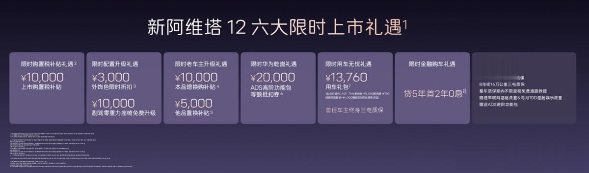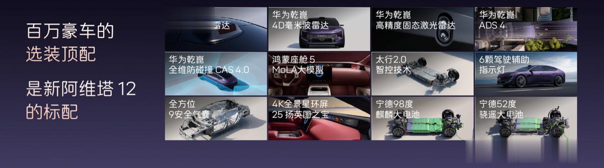 新阿维塔12定位未来智能豪华轿车,面向时代精英人群,主打豪华、智能、旗舰级出行体验。新车全系标配12项顶格配置,涵盖华为乾崑智驾全系统、太行智控2.0、35.4英寸4K全景星环屏、25扬英国之宝音响、全车9安全气囊等,百万豪车顶配选装功能悉数标配。同时推出六大限时购车礼遇,购置税补贴礼遇、配置升级礼遇、老车主升级礼遇、ADS高阶包抵扣权益、贷5年首2年0息金融礼遇、万元用车无忧礼遇,入门即满配,彻底打破豪华门槛。
